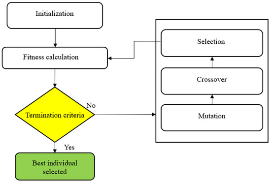 During the initialization, a population of candidate solutions is created randomly within predefined bounds and F and CR. The values chosen for CR and F in the initial population of DE impact the balance between exploration and exploitation. The generation counter is set at t = 0. The Mutation operation involves selecting three distinct individuals in the population and computing a mutant vector, with the scaling factor F. In crossover, a random vector with the proper dimension is generated and compared to CR. This comparison is employed to recombine the original solution with the mutant vector. Selection compares the trial solution’s fitness with the original solution’s fitness. If the trial solution is better (or equal), it replaces the original solution in the next generation. These steps are repeated sequentially until the algorithm terminates when the termination criterion is satisfied [35,37].