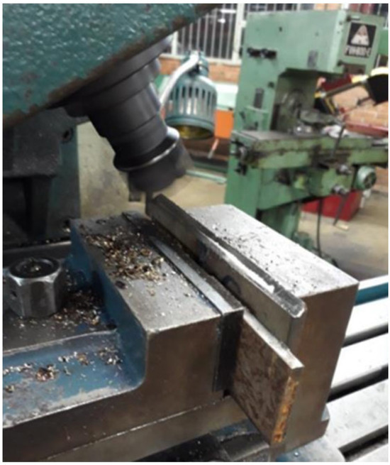 The samples were cut using a Cruanes TM10 (Selmach Machinery, Hereford, UK) guillotine shear, and the bevels were created using a Kone KFU2 (Limeira, Brazil) universal milling machine. Figure 5 illustrates the beveling machining process.
