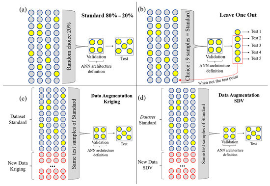 Data preparation. (a) Standard ANN separation. (b) Leave One Out condition. (c) Kriging data augmentation. (d) SDV data augmentation.