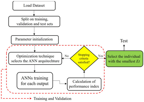 The procedure to optimize the ANN architecture is shown in Figure 7. The optimization technique chooses such an architecture, then the ANN is trained and evaluated on the validation and test sets. The performance on this set is used as a cost index for the optimization. The flowchart in Figure 7 presents the structure of optimization and ANN algorithms developed in the work.