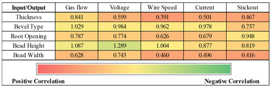 Table 4 presents the considered input and output data for developing the ANN in this work. Note that the inputs refer to the characteristics of the joint (sheet thickness, bevel type, root opening, bead height and bead width), while the outputs are welding parameters (gas flow, voltage, wire feed speed and stickout). The idea is that the welder specifies the desired characteristics of the joint and the ANN selects a proper set of welding parameters.