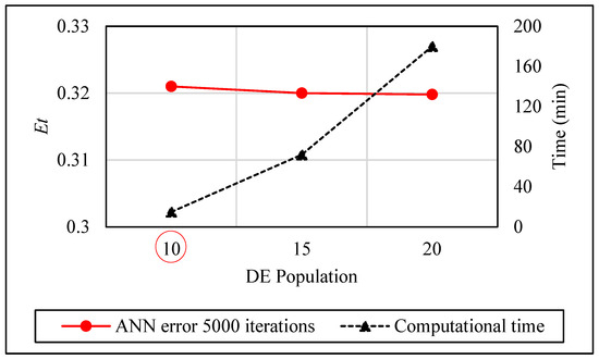 It is well known that the ANN’s architecture has a great impact on its performance. Herein, this architecture was optimized through DE. In particular, the number of neurons and hidden layers, the type of activation function and the learning rate (α) were considered as optimization elements. The chosen optimization range of each variable is the number of units (neurons) and the number of layers between 1 and 4, activation function in the range of linear (identity), logistic, tanh and learning rate between 0.01 and 0.1. After training the neural network, the mean average percentage error (MAPE) is calculated for each output on the validation and test sets. Mathematically, such an error is given by: