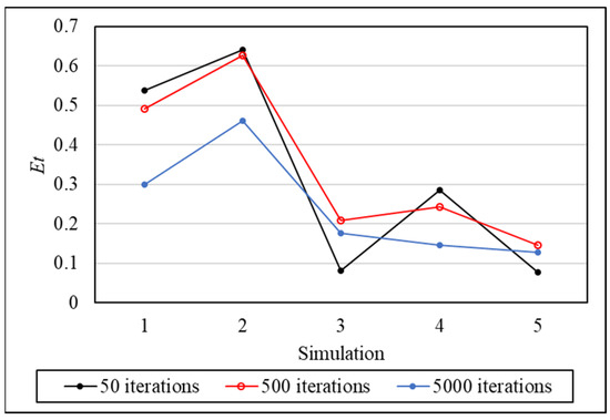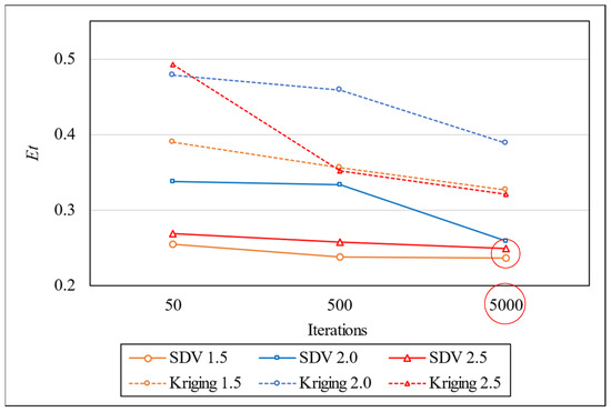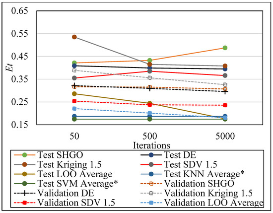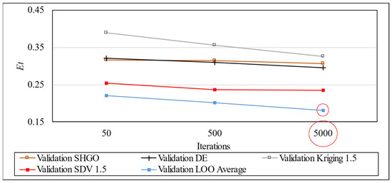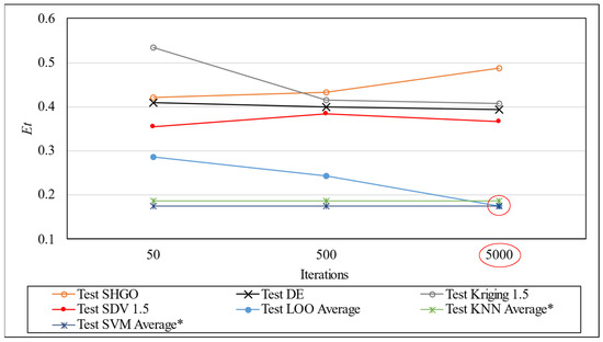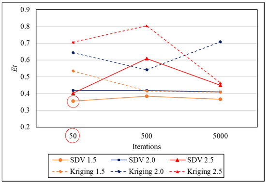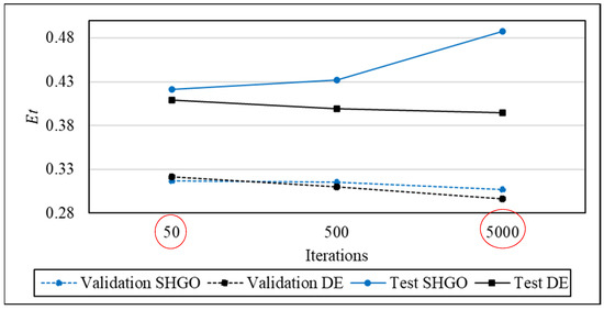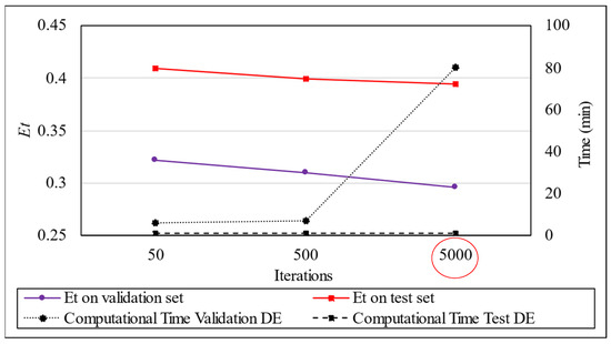 The total error (Et) is calculated by summing up the MAPE’s of all four outputs. Such an error is employed for comparison of the data augmentation and optimization techniques investigated. As a stopping criterion, the maximum number of iterations is equal to 50, and “best/1/bin” strategy was defined due to its simplicity and efficiency proven by other works, such as the parametric optimization of welding images in Cruz et al. [63], and the investigation of welding parameters in friction welding in the work by Srichok et al. [64], and Luesak et al. [65].