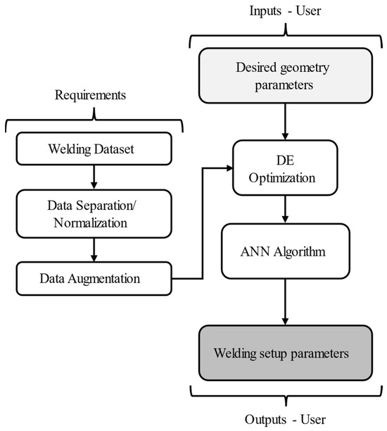 As in [21], the present work investigates a methodology for optimally choosing the ANN architecture and parameters during training in the context of welding. However, here, DE is employed and more parameters of welding inputs and outputs are investigated. The welding inputs (voltage, speed, gas flow rate, and stickout) are predicted from a definition of bead geometry by the welding operator. In addition, to address the small dataset problem, a comparison between data augmentation techniques is carried out. The present work also aims to develop a methodology for an application to help the welder. This work also focuses on producing a dataset of welding with randomly chosen parameters to reach a wider dataset while in [21] employs Box–Behnken design within a design of experiments (DOE) framework.