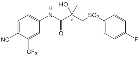 The molecular structure of Bicalutamide [29] (the asterisk on the molecule indicates a chiral center).