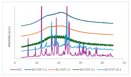 The similarity of the dissolution characteristics was confirmed by the calculation of the f2 statistic (Table 1). The f2 values were 62.4 and 67.6 for the 1:1 and 2:1 weight ratios, respectively, stored under long-term conditions. For samples stored under accelerated conditions, the calculated f2 values were 53.7 and 86.7 for 1:1 and 2:1 samples, respectively. In contrast, a decrease in the amount of dissolved BCL was observed in the 4:1 and 10:1 formulations under both storage conditions. After 12 months, approximately 60% and 50% of BCL dissolved from the 4:1 formulation under long-term and accelerated conditions, respectively. The 10:1 solid dispersion was not resistant to storage conditions. A decrease in the dissolved amount of BCL was registered after three months of storage, and after 12 months, the amount of BCL dissolved was comparable to that of the raw BCL. The influence of the storage conditions on the dissolution was confirmed by the f2 statistic. The f2 values for these samples were less than 50, which indicated significant differences between 4:1 and 10:1 stored samples compared to freshly analyzed ones, and suggested the influence of storage conditions on dissolution performance. The dissolution data are consistent with the XRD findings. Amorphization of BCL significantly enhanced its dissolution, and the incorporation of PVP enabled the formation of stable amorphous solid dispersions.