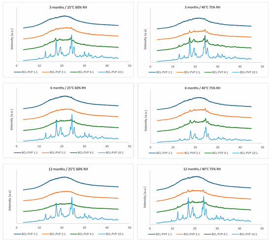 X-ray of 1:1, 2:1, 4:1, 10:1 bicalutamide and PVP K29/32 solid dispersions after stability study in long-term (25 °C 60% RH (left panel)) and accelerated (40 °C 75% RH (right panel)) conditions for three, six, and twelve months.