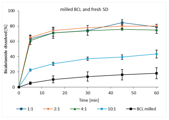Dissolution profiles of 1:1, 2:1, 4:1, 10:1 bicalutamide and PVP K29/32 solid dispersions. The samples were analyzed immediately after preparation [43].
