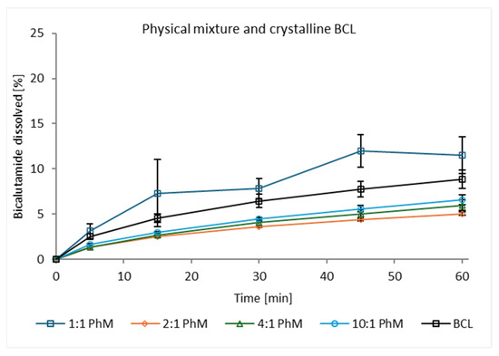 Dissolution profiles of crystalline bicalutamide and 1:1, 2:1, 4:1, 10:1 bicalutamide and PVP K29/32 physical mixture [28].