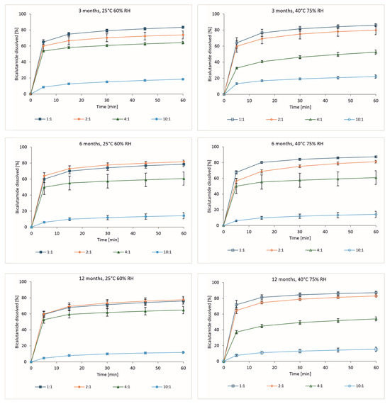 Dissolution of 1:1, 2:1, 4:1, 10:1 bicalutamide and PVP K29/32 solid dispersions after stability study in long-term (25 °C 60% RH, (left panel)) and accelerated (40 °C 75% RH, (right panel)) conditions for three, six, and twelve months.
