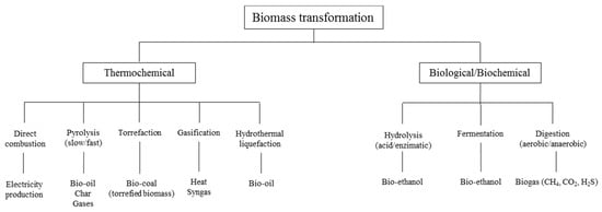 A thermochemical process is a method of converting lignocellulosic or other types of biomasses into gas molecules such as hydrogen, carbon monoxide, carbon dioxide, methane, etc. These molecules have the potential to be converted into Fischer–Tropsch fuels, alcohols, or other chemical compounds [1]. Thermochemical methods include a range of processes, such as gasification, direct combustion, and pyrolysis, which are used to transform biomass into gaseous, liquid, or solid fuels, depending on the temperature and amount of oxygen used during the reaction [4]. In addition, thermochemical conversion is a more efficient process than biochemical transformation due to the high conversion efficiency and relatively short residence time. Figure 1 shows the different pathways of biomass conversion.