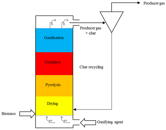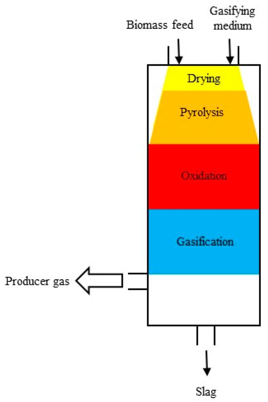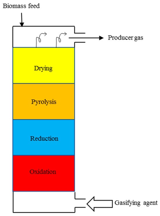 Extensive research has been carried out on fixed bed gasifiers, which are widely considered to be the most suitable reactor for biomass gasification. This is mainly due to the simple operational and design characteristics of these reactors, and they are mainly classified according to their mode of operation, which includes updraft, downdraft, and cross-draft gasifiers. In a fixed-bed updraft reactor, the gas is introduced at the base of the grate zone. This results in the formation of a countercurrent flow between the biomass and the gasification medium. Subsequently, the biomass is subjected to a drying process, which is followed by pyrolysis, reduction, and oxidation. The drying process is facilitated by the utilization of the sensitive heat of the producer gas, which ascends prior to its departure from the reactor. Concurrently, the gases produced during pyrolysis do not fully reach the oxidation zone, where a considerable quantity of tar is present in the producer gas. The moisture content of the biomass does not present a limiting factor for this reactor; however, the cold gas efficiency is relatively low [68]. The updraft gasifiers have the disadvantage of producing larger amounts of tar, with concentrations ranging from 10 to 150 (g Nm−3) [69,70]. Figure 2 shows a schematic view of an updraft gasifier.
