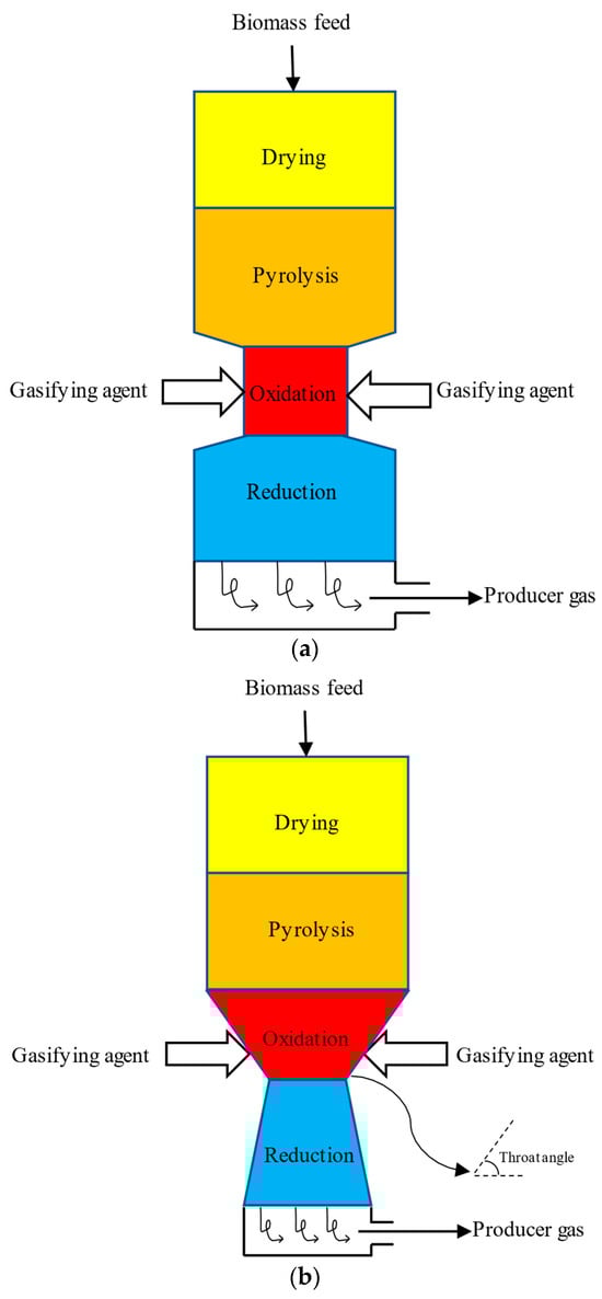 In contrast, downdraft gasifiers produce up to 6 (g Nm−3) of tars [71]. The downdraft gasifiers are commonly utilized due to the minimal production of tar and the superior quality of the syngas. The downdraft gasifier is also referred as a co-current gasifier. There are two principal categories of downdraft gasifiers: (1) stratified or throatless gasifiers, and (2) Imbert or throated gasifiers. In the case of Imbert gasifiers, the flow and temperature are not uniform in the throat section, which may give rise to issues when scaling up to greater flows and biomass amounts. The throat angle is very important in this type of gasifier because the conversion decreases as the throat angle increases. On the other hand, the length of the gasification zone increases as the throat angle decreases [19].
