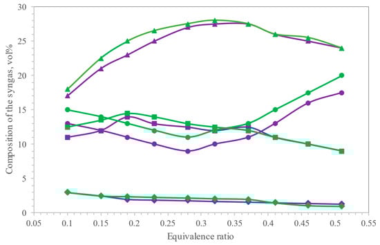 The equivalence ratio (ER) is commonly used when oxygen or air is employed in gasification. It represents the ratio of oxygen required for gasification to the stoichiometric oxygen needed for the complete combustion of biomass. A higher ER value indicates a lower tar amount, as more oxygen can be consumed during the reaction. Conversely, a higher ER value results in a lower amount of hydrogen and carbon monoxide in the producer gas, as the biomass is primarily combusted, with the production of carbon dioxide and water being highly prevalent [86,87]. At elevated excess ratios, the majority of the hydrogen is consumed by oxidation reactions [16]. Consequently, the value of the equivalence ratio is typically situated between 0.2 and 0.4 [68].