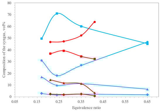 How producer gas as a function of ER from 0.21 to 0.41 varies while maintaining a constant gasification temperature of 950 °C under air + steam was studied [92]. The authors found that increasing the ER is associated with a decline in the yield of hydrogen and carbon monoxide that was converse to the carbon dioxide concentration, which is attributed to the enhanced oxidation reactions for both hydrogen and carbon monoxide as the oxygen enters the gasifier at higher ER. Consequently, elevated ER are more conducive to the formation of carbon dioxide at the expense of hydrogen and carbon monoxide. Furthermore, an increase in ER by oxidation results in a decrease in methane concentration, leading to the formation of carbon dioxide and water. This relationship is further supported by the observation that an increase in ER leads to a corresponding decline in the HHV. In a separate case study, the range of ER values was from 0.17 to 0.65, as Figure 7 shows; these values were plotted from distinct data published by the authors [92]. Initially, a decrease in the concentration of carbon monoxide and carbon dioxide was observed, with an increase in ER from 0.17 to 0.24. Conversely, an increase in hydrogen was observed, whilst methane decreased as the dry reforming reaction occurred. Furthermore, when ER in the dry reforming reaction exceeds 0.24, there is an increase in the concentration of carbon dioxide, whilst the concentration of carbon monoxide, hydrogen, and methane decrease due to the oxidation reactions.