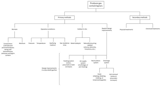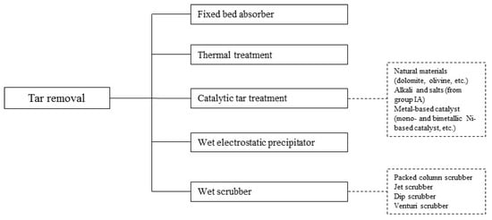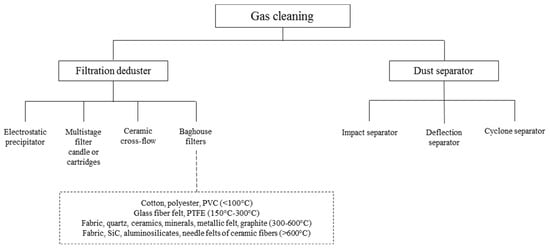 In the field of gasification technologies, a prevailing issue has been identified as the presence of tar, which has been shown to be the most problematic group of compounds. The condensation of water vapor in the gas that is in the presence of tar has been demonstrated to result in the generation of contaminated water requiring management. Additionally, the gas contains solid particles, such as unreacted char or mineral components (ash), in varying quantities, which can form agglomerates within the system. In the context of catalytic applications of the producer gas, such as tar reforming, fuel cell utilization, or gas synthesis, it is imperative that the gas undergoes further purification from trace components containing sulfur, nitrogen, or chlorine [106].