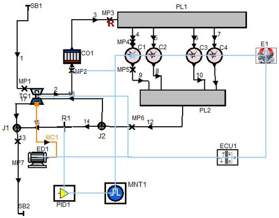 The electrically assisted turbocharged automotive diesel engine, which is shown in Figure 1, was modeled by using the Boost tool of AVL Advanced Simulation Technologies. The electrical device, which can work in both motor and generator mode, was mechanically connected to the turbocharger for power assistance. An electronic control unit was used to control electrical devices in the model.