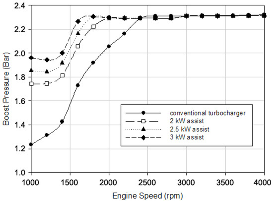 - The boost pressure of the conventional turbocharged diesel engine was increased with electrical power assistance. The boost pressure was increased by 41.2%, 50.2%, and 58.9% at a 1000 rpm engine speed with 2, 2.5, and 3 kW electrical power assistance, respectively. The average increment was 22%, 27%, and 30.9% with electrical power assistance of 2, 2.5, and 3 kW, respectively, for the low engine speed zone, which is between 1000–2200 rpm.