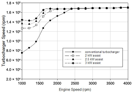 - The results revealed that the engine speed where the maximum turbocharger speed was obtained was reduced from 2400 rpm to 2000, 1800, and 1600 rpm with 2, 2.5, and 3 kW electrical power assistance, respectively.