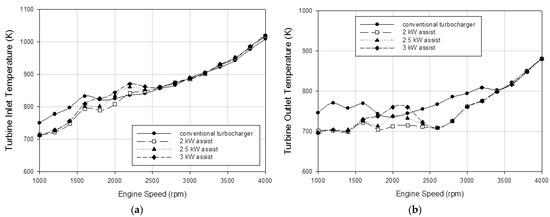 The average reduction for the turbine inlet temperature was 4%, 2.5%, and 0.5% with 2, 2.5, and 3 kW electrical power assistance, respectively, for the low engine speed range (1000–2200 rpm). Furthermore, the average reduction for the turbine outlet temperature was 6.1%, 5%, and 3.6% with 2, 2.5, and 3 kW electrical power assistance, respectively, for the low engine speed range.