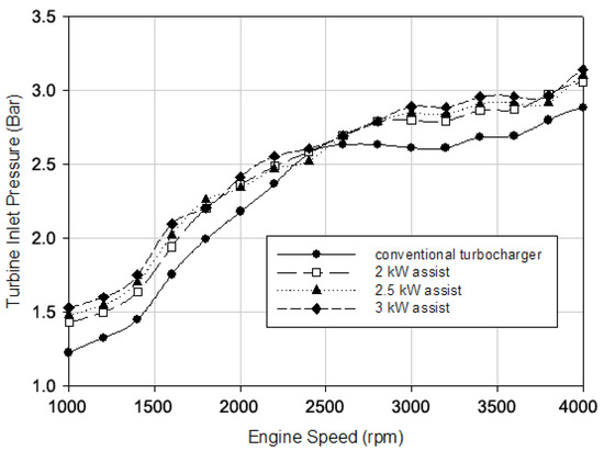 Turbine inlet pressure versus engine speed for different electrical power assistance levels.