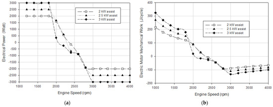 (a) Electrical power and (b) electric motor mechanical work engine speed for different electrical power assistance levels.