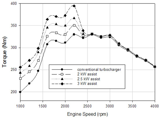 - According to the engine simulation results, the engine torque of the conventional turbocharged diesel engine was increased by 15.6%, 22%, and 28.2% at 1000 rpm, 12.1%, 18.1%, and 23.9% at 1200 rpm, and 9.4%, 17%, and 20.6% at 1400 rpm engine speeds with 2, 2.5, and 3 kW electrical power assistance, respectively.