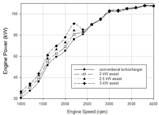 The effects of different electrical power assistance levels on engine power values according to varying engine speeds at full-load conditions are presented in Figure 8. It demonstrates a similar trend to the engine torque versus engine speed graph because the engine power is directly proportional to the engine torque. Therefore, the same improvements were obtained for the engine power as the engine torque.