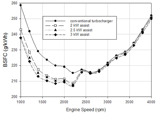 Figure 9 indicates the variation in BSFC values according to varying engine speeds for different electrical power assistance levels at full-load conditions. BSFC was reduced with electrical power assistance where the electric device acts as a motor at the low engine speed zone. The BSFC of the conventional turbocharged diesel engine was improved by 6%, 8%, and 8.1% at 1000 rpm, 5.5%, 7%, and 8% at 1200 rpm, and 5%, 6%, and 7% at 1400 rpm engine speeds with 2, 2.5 and 3 kW electrical power assistance, respectively. The average improvement is 4.5%, 5.4%, and 6.1% with electrical power assistance of 2, 2.5, and 3 kW, respectively, for the low engine speed zone. It can be stated that providing electrical power assistance to the conventional turbocharger improves fuel efficiency during the low engine speed zone.
