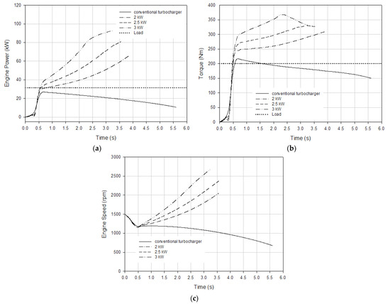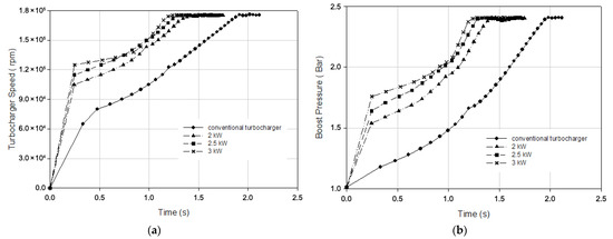 The load acceptance of the engine under transient operating conditions at a sudden load increase and under different turbocharger configurations is presented in Figure 10. The simulation introduces a 200 Nm sudden load application to the engine at 1500 rpm. Electric motors such as 2 kW, 2.5 kW, and 3 kW ensured a faster boost pressure rise and therefore allowed for larger quantities of the fuel to be injected into the cylinder. It is evident that the engine equipped with the electrically assisted turbocharger can accept a higher instant load. It can be stated that load acceptance of the engine was improved with electrical power assistance provided to the engine. Also, the conventional turbocharged engine could not respond to the load, so the engine speed decreased with respect to the increase in time. The electrically assisted turbocharger could accept the engine load; it took 3.75, 2.85, and 2.15 s for the engine to reach a 2000 rpm engine speed from 1500 rpm with 2, 2.5, and 3 kW electrical power assistance, respectively. Higher electrical power assistance resulted in a faster response to the load, which means a greater improvement in transient response.