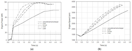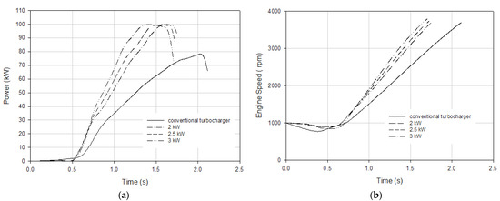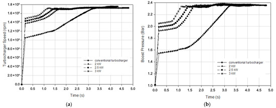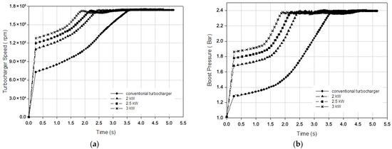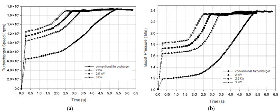 Figure 15 represents the variation in engine power and speed according to time for different electrical power assistance levels under a 100 Nm engine load at a 1000 rpm engine speed. According to the figure, it took 4.32 s for the conventional turbocharged engine to produce 60 kW of engine power, and when the electrically assisted turbocharger was used, this time was reduced to 2.90, 2.44, and 2.04 s with 2, 2.5, and 3 kW electrical power assistance, respectively. The simulation results revealed that the engine load response time improved by 33%, 44%, and 53% with 2, 2.5, and 3 kW electrical power assistance, respectively. Also, the conventional turbocharged engine reached a 2000 rpm engine speed in 3.63 s. This time decreased to 2.97, 2.61, and 2.32 s with 2, 2.5, and 3 kW electrical power assistance, respectively. It can be stated that the transient response of the engine was improved by 11%, 20%, and 36% with 2, 2.5, and 3 kW assistance, respectively.