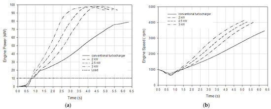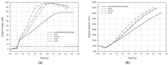 Figure 11 represents the variation in engine power and speed according to time for different electrical power assistance levels at an engine load under 100 Nm at a 1500 rpm engine speed. According to Figure 11, it took 3 s for the conventional turbocharged engine to produce 70 kW of engine power, and when the electrically assisted turbochargers were used, this time was reduced to 1.48, 1.27, and 1 s with 2, 2.5, and 3 kW electrical power assistance, respectively. The simulation results revealed that the engine load response time improved by 51%, 58%, and 67% with 2, 2.5, and 3 kW electrical power assistance, respectively. The conventional turbocharged engine attained 3000 rpm engine speed in 3.37 s under a 100 Nm load at a 1500 rpm initial engine speed. This time decreased to 2.43, 2.07, and 2.07 s with 2, 2.5, and 3 kW electrical power assistance, respectively. It can be stated that the transient response of the engine was improved by up to 40% with electrical power assistance.