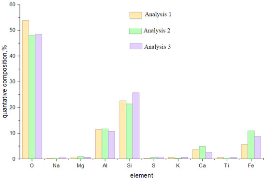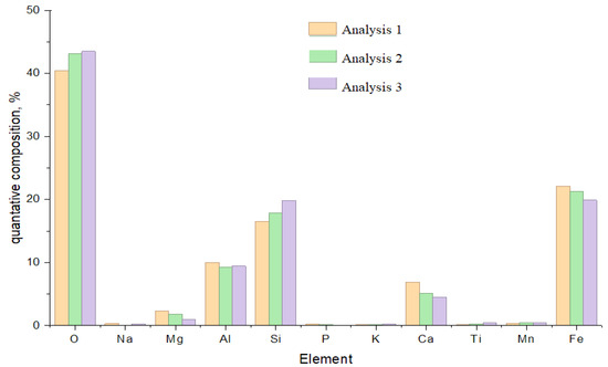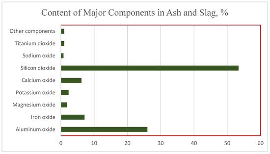 The chemical composition of ash and slag is shown in Figure 1 and Figure 2. The dominant components are silicon, aluminum, iron, and calcium oxides, the total content of which is up to 93% of the sample mass. An analysis shows that silicon dioxide makes up about 53.4% of the material mass, and about 33.1% is accounted for by aluminum and iron oxides. The proportion of alkaline and alkaline earth components in the ash residue does not exceed 8%.