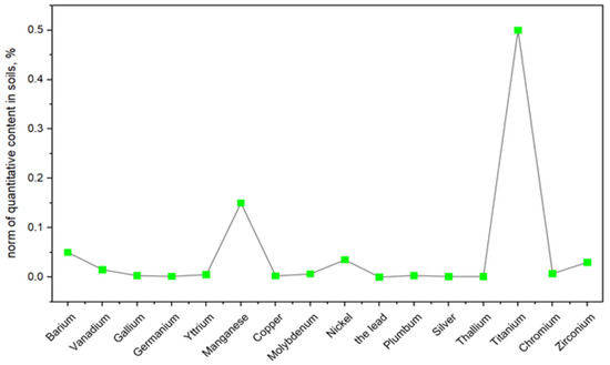 To study the trace element composition of ash and slag, a sampling profile was established in the basin of ash dump No. 1, with soil samples collected according to lithological horizons. In total, three samples of aged ash and slag were collected at depths of 1, 2, and 3 m. The samples were prepared and analyzed at the State Scientific Production Association of Ecology “Kazmekhanobr”. The results of the chemical composition analysis of aged ash and slag are presented in Figure 3 and Figure 4.