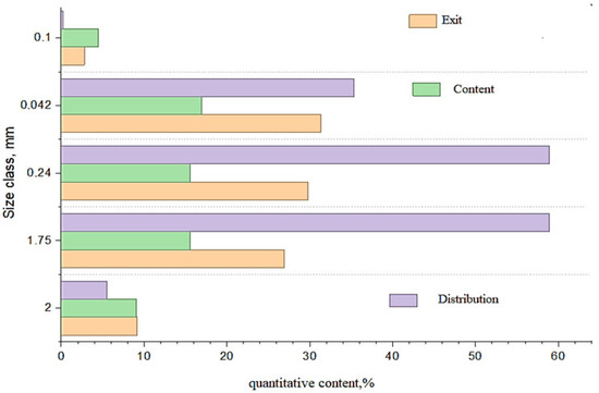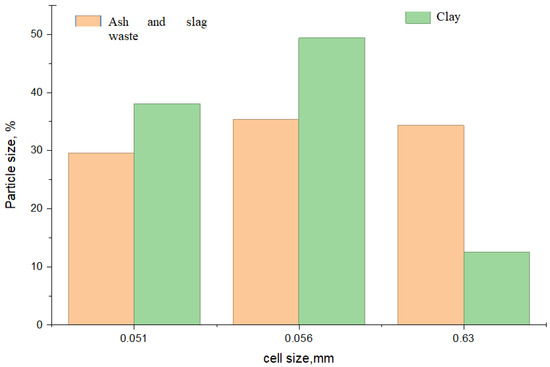 One of the key indicators of raw materials is their particle size distribution. Figure 19 shows the analysis of the dust fraction (−0.044 mm) of ash and slag waste. The presence of this fine fraction indicates that the ash and slag waste contains a high proportion of fine particles. The higher the content of micro-dispersed particles, the greater the plasticity of the material.
