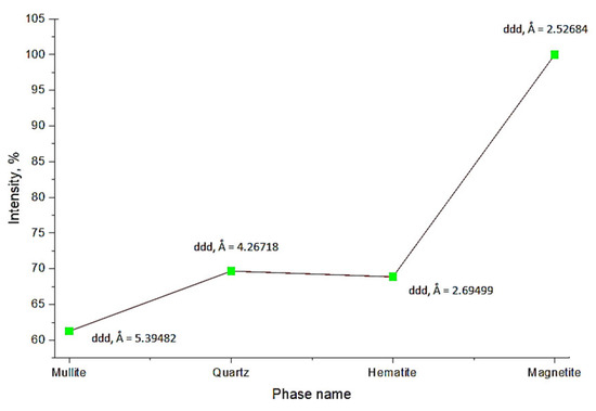 The mineral and chemical composition of the dust (−0.044 mm) fraction of ash and slag waste is presented in Figure 19, Figure 20, Figure 21 and Figure 22.