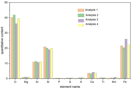 The composition of long-flame coal ash and slag is represented by aluminosilicates, including mullite, quartz, hematite, and magnetite (Figure 14). The chemical composition is dominated by the oxides SiO2, Al2O3, Fe2O3, CaO, MgO, and TiO2 (Figure 17 and Figure 18).