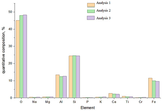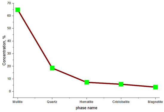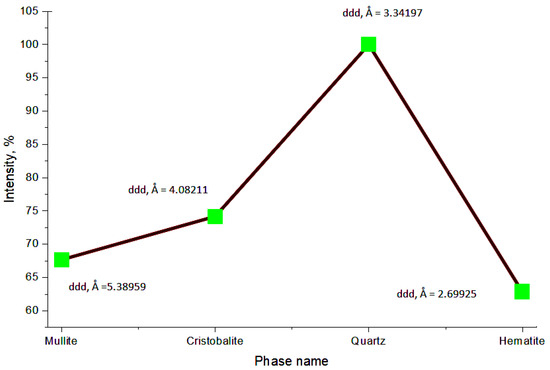Elemental and X-ray phase analyses made it possible to determine the proportion of major oxides in the studied samples: ash and slag. SiO2 and Al2O3 dominate in the composition of ash and slag, indicating their aluminosilicate nature (Figure 12 and Figure 13). A significant content of Fe2O3, as well as fluxing oxides such as K2O, CaO, and MgO—with a combined content exceeding 10%—makes these materials effective components for lowering the sintering temperature.
