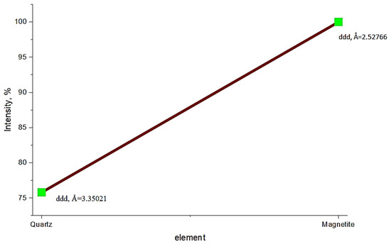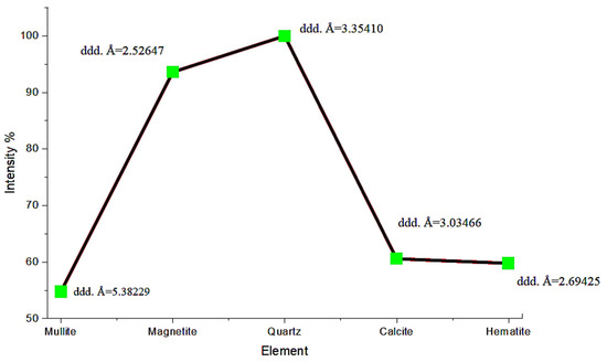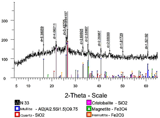 The presence of a broad background in the range of 20–55° indicates the existence of an amorphous glassy phase. Secondary peaks may be attributed to hematite (Fe2O3) (Figure 17), which supports the chemical analysis data indicating the presence of Fe and Ti.