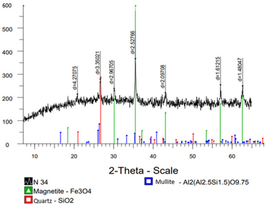 The ash and slag sample is characterized by an intense peak at approximately 26.6° and 36.2°, corresponding to the main reflection of quartz (SiO2). Additionally, reflections corresponding to mullite (Al6Si2O13) were identified.