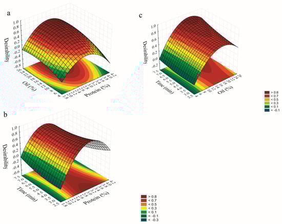 Desirability surface plots showing the interaction effects of oil–protein (a), time−protein (b), and time−oil (c).
