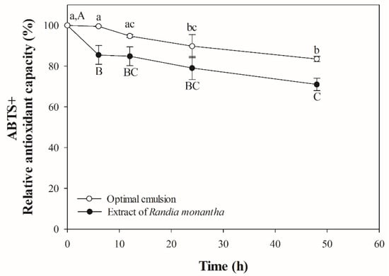 Photooxidative stability of optimal emulsion and extract of Randia monantha. Lowercase letters indicate statistical differences within the same treatment group over time. Capital letters indicate statistical differences between treatment groups at the same time point.