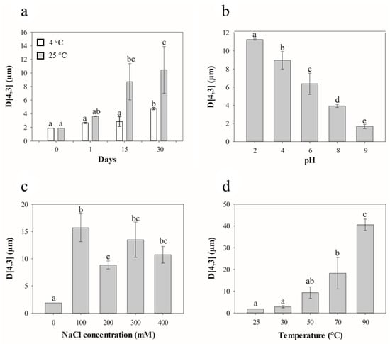 Effect of storage (a), pH (b), NaCl concentration (c), and temperature (d) on the surface mean particle size of the optimal emulsion. Treatments with different letters differ significantly (p < 0.05).