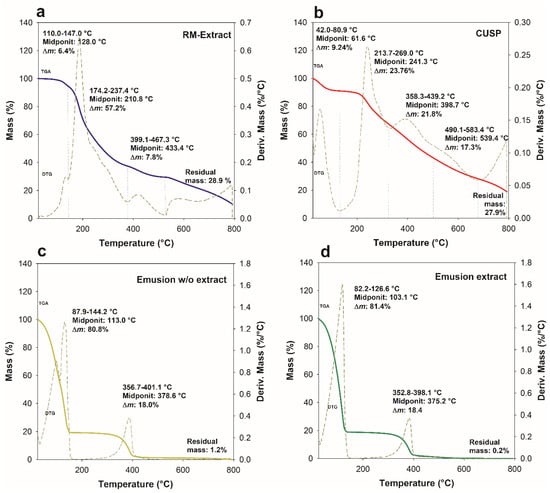 The TGA and DTG curves of the extract and CUSP showed an initial thermal event associated with water content below 200 °C (Figure 4). The extract exhibited a second phase of mass loss between 174.22 and 237.4 °C, accounting for 57.2% of the total mass (Figure 4a). This mass loss could be attributed to the decomposition of acidic phenolic compounds present in the extract, such as ferulic acid, gallic acid, caffeic acid, vanillic acid, and chlorogenic acid []. Phenolic acids can undergo bond cleavage at elevated temperatures, resulting in the formation of smaller molecular structures [,]. A third mass loss of 7.8% was observed in the range of 399.1−467.3 °C. This mass loss was attributed to the decomposition of products derived from phenolic acids generated in earlier stages, as well as larger molecular structural compounds [].