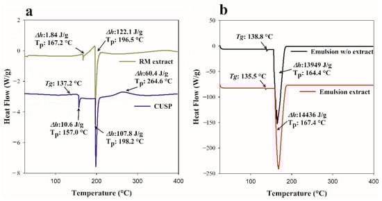 The emulsion, whether containing the extract or not, displayed a Tg very close to that of the protein, indicating an effect of CUSP on the formulation (Figure 5b). Both emulsions exhibited a single endothermic event. This event occurred at a higher temperature and with greater enthalpy in the emulsion that contained the extract, indicating better thermal stability. The DSC curve for the emulsion containing the extract did not show the typical endothermic peak associated with the extract itself (Figure 5a). This observation suggests that the extract has been effectively encapsulated within the emulsion droplets. Such findings may indicate a robust interaction between the CUSP and the core material, further corroborated by the high entrapment efficiency (Section 3.4). Consequently, the interactions among the various components contributed to the emergence of new endothermic peaks in the thermal profile (Figure 5b). Indeed, the interactions or formations of complexes may be discerned through the analysis of both the intensity (enthalpy) and the expansion of the endothermic peak relative to the other components present in the formulation []. The research findings suggest that CUSP functions as an emulsifier, imparting thermal stability to compounds with significant biological value. Consequently, it serves as an effective alternative to plant-based protein for preserving heat-sensitive compounds.