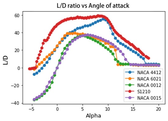 The selection of specific airfoils was based on their common use in the design of SHAWT, ensuring the relevance and applicability of the study’s results. These airfoils were chosen to accurately reflect the aerodynamic features needed for optimal performance in these wind turbines. Figure 4 shows how lift and drag coefficients vary with the angle of attack for the five examined airfoils at . Although curves assist in visualizing overall trends in the airfoil’s aerodynamic properties, selecting the optimal airfoil for designing a small wind turbine rotor requires further analysis.