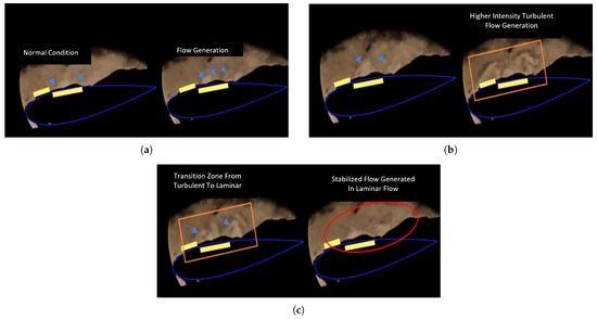 Schlieren visualization of the NACA 4412 airfoil with DBD plasma actuator. The figure illustrates the optical observations obtained under various operating conditions, highlighting the impact of plasma actuation on the flow field and delineating the transition and stabilization regions. (a) Flow visualization under normal and activated plasma conditions; (b) activated plasma displaying higher-intensity turbulent flow (orange box); (c) flow transition and stabilization: from turbulent to laminar transition zone (orange box) and stabilized laminar region (red ellipse).
