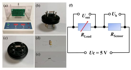 (a) WS-30A gas sensor test system instrument; (b,c) photos of the gas sensor; (d,e) the gas-sensitive elements: (d) four platinum wires fixed on the gold electrode of the alumina ceramic tube as electrical contacts, (e) Ni-Cr alloy coil; and (f) equivalent circuit diagram of WS-30A gas sensor test system [39].