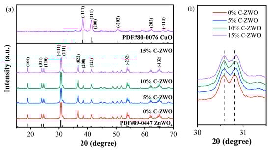 (a) XRD patterns of 0%, 5%, 10%, and15% C-ZWO and CuO samples, (b) the (−111) and (111) peaks.