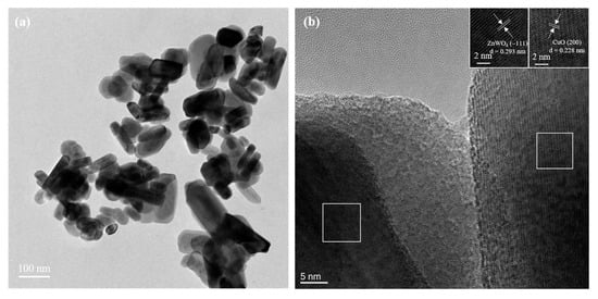 As can be observed in the SEM and TEM images in Figure S1 and Figure 3a, the synthesized samples are mainly composed of irregular particles with particle sizes less than 50 nm, and the smallest can reach 20–30 nm. Basically, a smaller grain size implies a larger surface area and, thus, more active sites for H2S adsorption, which improves the sensitivity [10]. The HRTEM images (Figure 3b and insets) exhibit the crystal plane spacings of 0.293 and 0.228 nm, attributed to the (−111) crystal plane of ZnWO4 and the (200) crystal plane of CuO, respectively, confirming the CuO and ZnWO4 in the 10% C-ZWO sample.